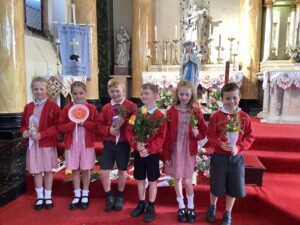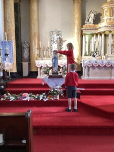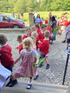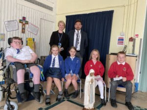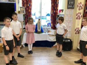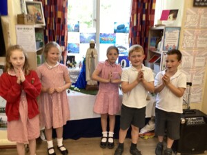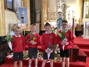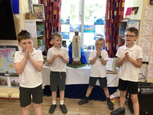 • Spiritual Preparation: During the month of May, the whole school took part in a procession, from our school to St. Thomas’ the Apostle Church, in Claughton-on-Brock. Children came prepared with flowers and loud voiced as we celebrated the Mary, our patron saint. As a school we received the Lady of Lourdes statue as it toured around all the schools in Lancaster Diocese. The children really enjoyed interacting with the statue creating wonderful artwork and using it as an inspiration for prayer and our Mary unit of work in RE lessons.